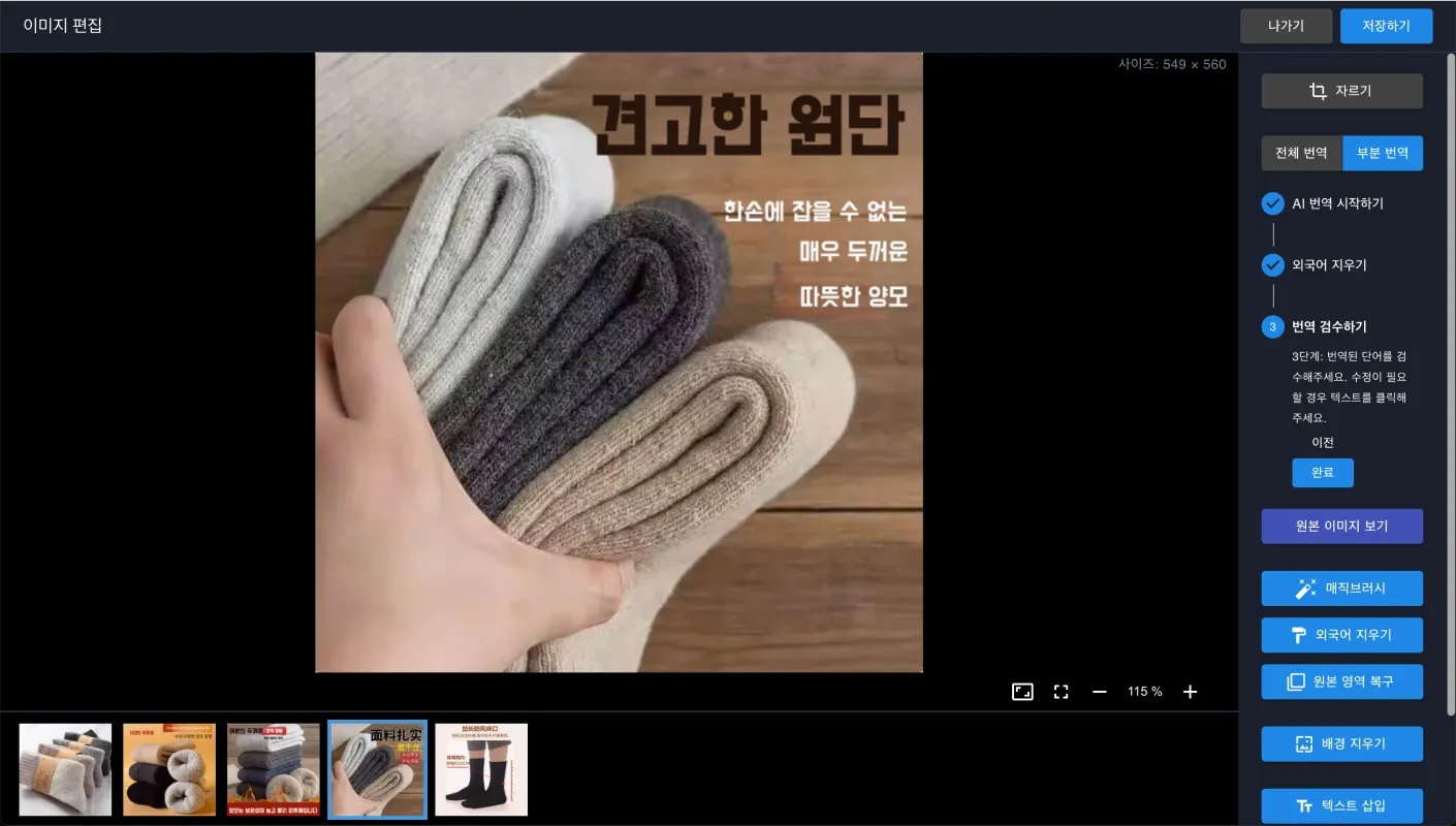 예를 들어 현재 윈들리는 인공지능 기술을 활용해서 이커머스 분야에서 자주 사용하는 전문 용어와 상품 이미지를 학습시키고, 자연스럽게 의역과 합성을 할 수 있게 만들고 있어요. 기존에는 셀러들이 중국어나 영어를 일일이 한국어로 번역해서, 포토샵으로 최대한 어색하지 않게 합성해 넣어야 했는데요. 윈들리로 그 시간을 크게 줄일 수 있게 되었습니다. (이미지 번역기능)